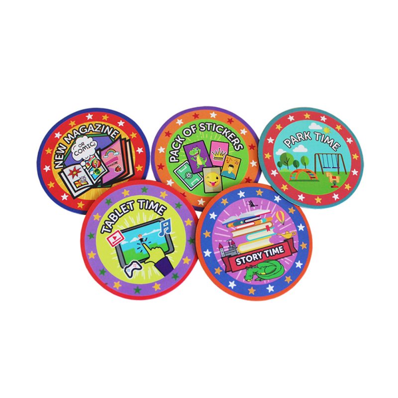 - 10 x illustrated circular reward magnets: activity time; park time; a new toy; a new magazine; a new pack of stickers; tablet time; television time; cuddle time; story time and a customise your own option (use a white board pen to be able to re-customise).